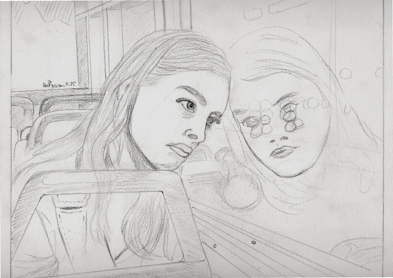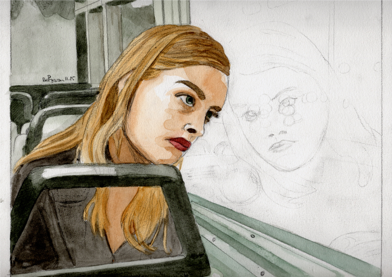 Nous voilà donc avec The Last Train. J’étais très stressé à l’idée de me lancer dans la peinture de la partie reflet dans la vitre. J’ai alors commencé par dessiner au crayon ce que je voulais voir apparaître.